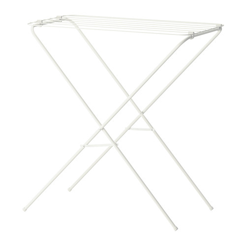 The JÄLL Drying Rack definitely holds half my usual laundry, particularly jeans and delicate fabric clothes that may get damaged or shrink in the dryer. Lord knows I've lost a few blouses and pants to shrinkage. It is a bit wobbly and seems very light and inexpensive. Because it is, at $9.99, it's the least expensive drying racks I've seen that aren't made of plastic. It has charm just hanging out in a corner in my room while used, and then disappears behind the door when it's not being used.